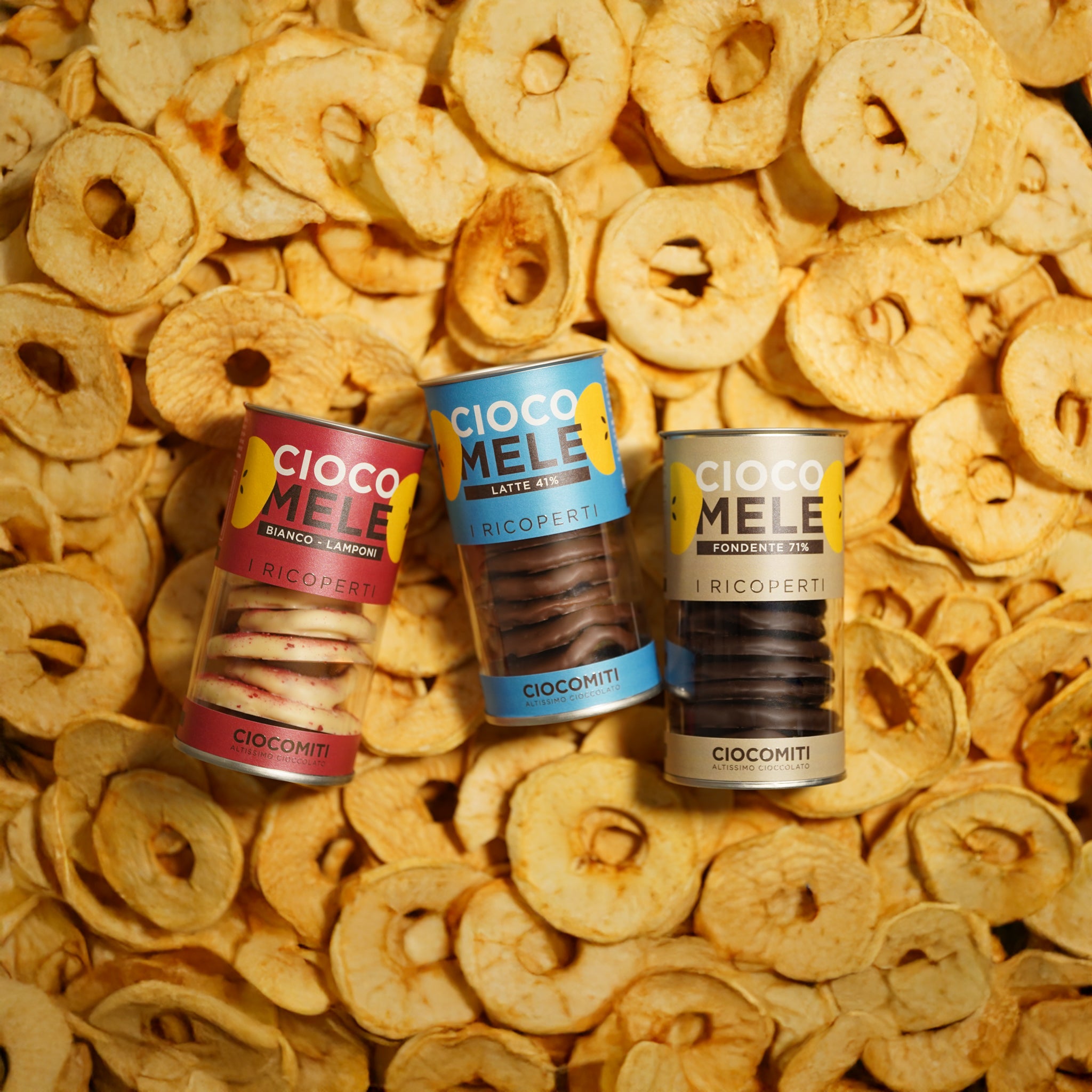 Le più dolci e croccanti mele Golden delle nostre valli si trasformano in prelibate rondelle ricoperte di cioccolato. Latte, fondente, bianco con polvere di lamponi: tre gusti semplicemente irresistibili.